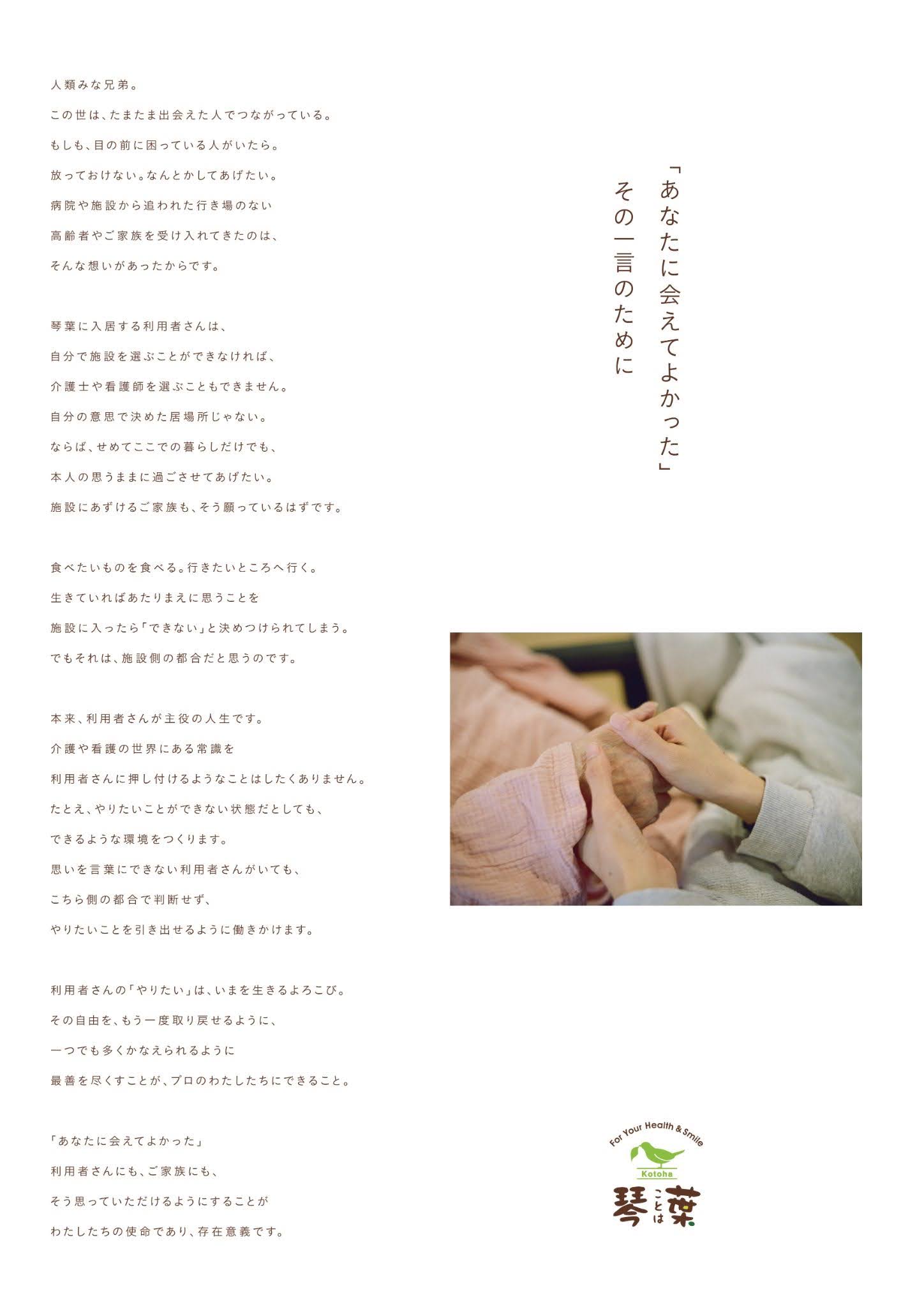 今後も、より多くの介護・看護を必要とする方々へ琴葉の想いを届けられるよう、コーポレートサイトやパンフレットなどを制作し、多様な形で理念を基盤とした発信を広げていきます。