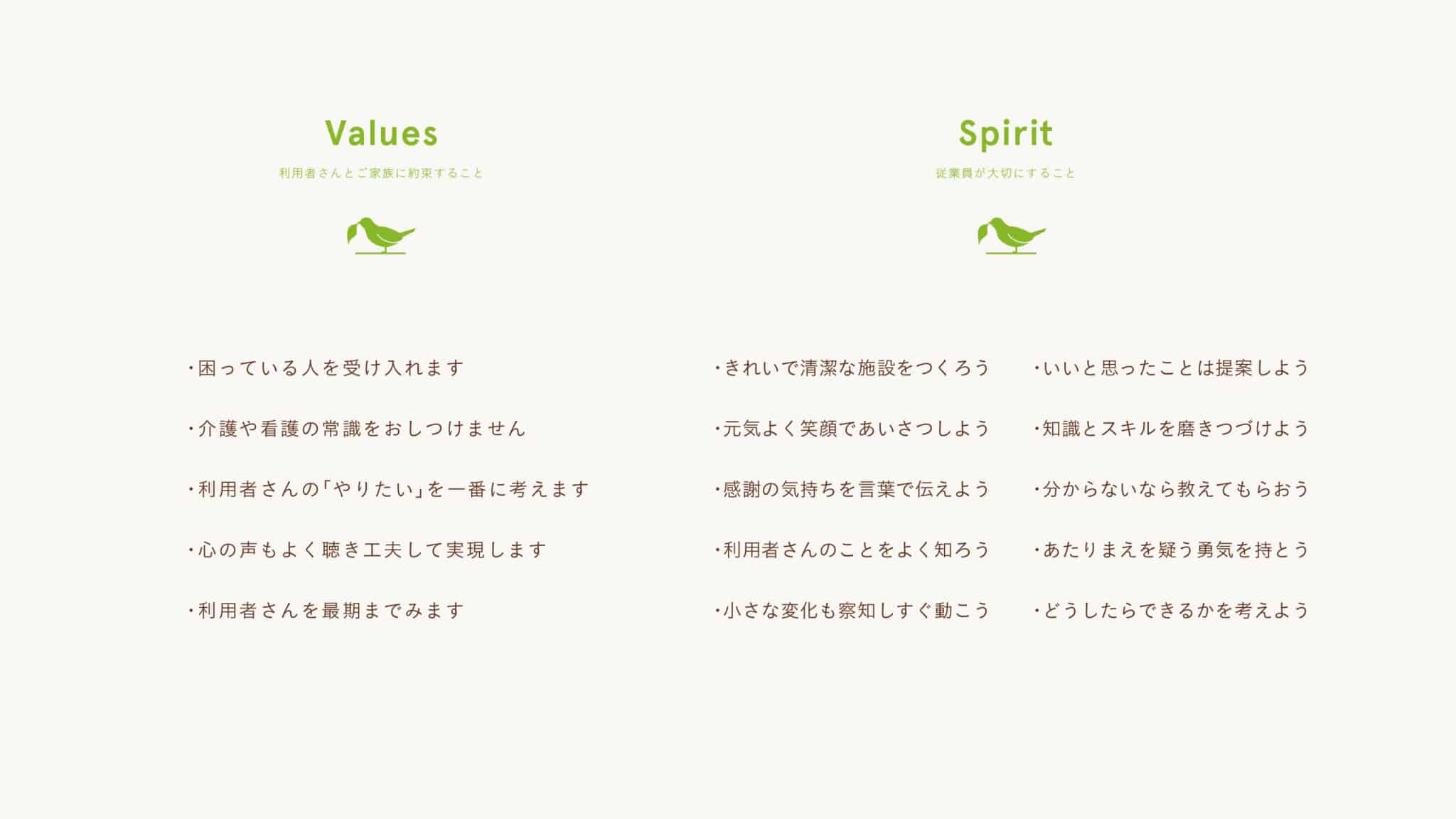 もともと理念として掲げていた「あなたに会えてよかった」という言葉を、このプロジェクトを通してメンバー全員が深く理解・共感することができました。そして、日頃の行動指針にまで落としていけるよう、ミッション、ビジョン、バリュー、スピリットを定めていきました。