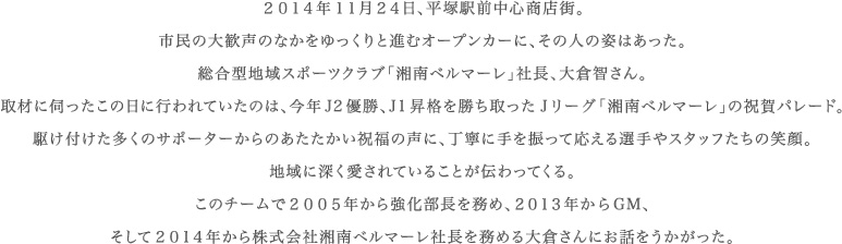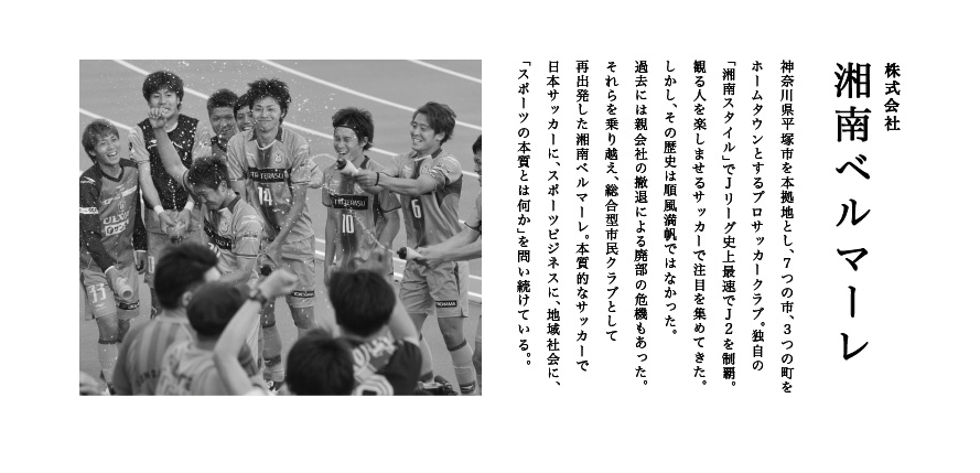 人生と地域を豊かにするスポーツ文化、それが根ざしている世の中づくりという大きなビジョンを見定めて、クラブ一丸、地域一丸となって動きだしているベルマーレ。まだまだ道半ばと、地元の7市3町を忙しく動き回る大倉さん。地域経済の活性、子どもたちの成長、市民の健康への貢献、働く場所づくり……、地域の人々のたくさんの想いを託されて、湘南ベルマーレというこころざしは、さらに熱く、強くなる。