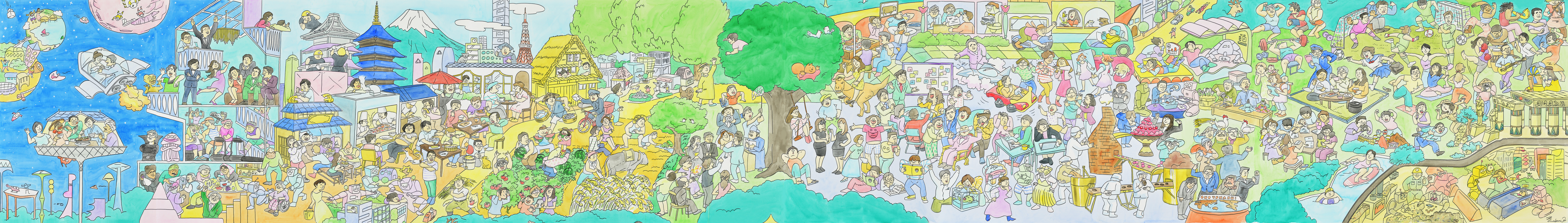 In "A VISION OF JAPAN IN 2116" , we asked "What will Japan be like in 100 years?" to a unique, diverse group of Japanese companies, and depicted them in a single landscape. We created this painting with the faith that in 2116, Japan will be full of hope and happiness.